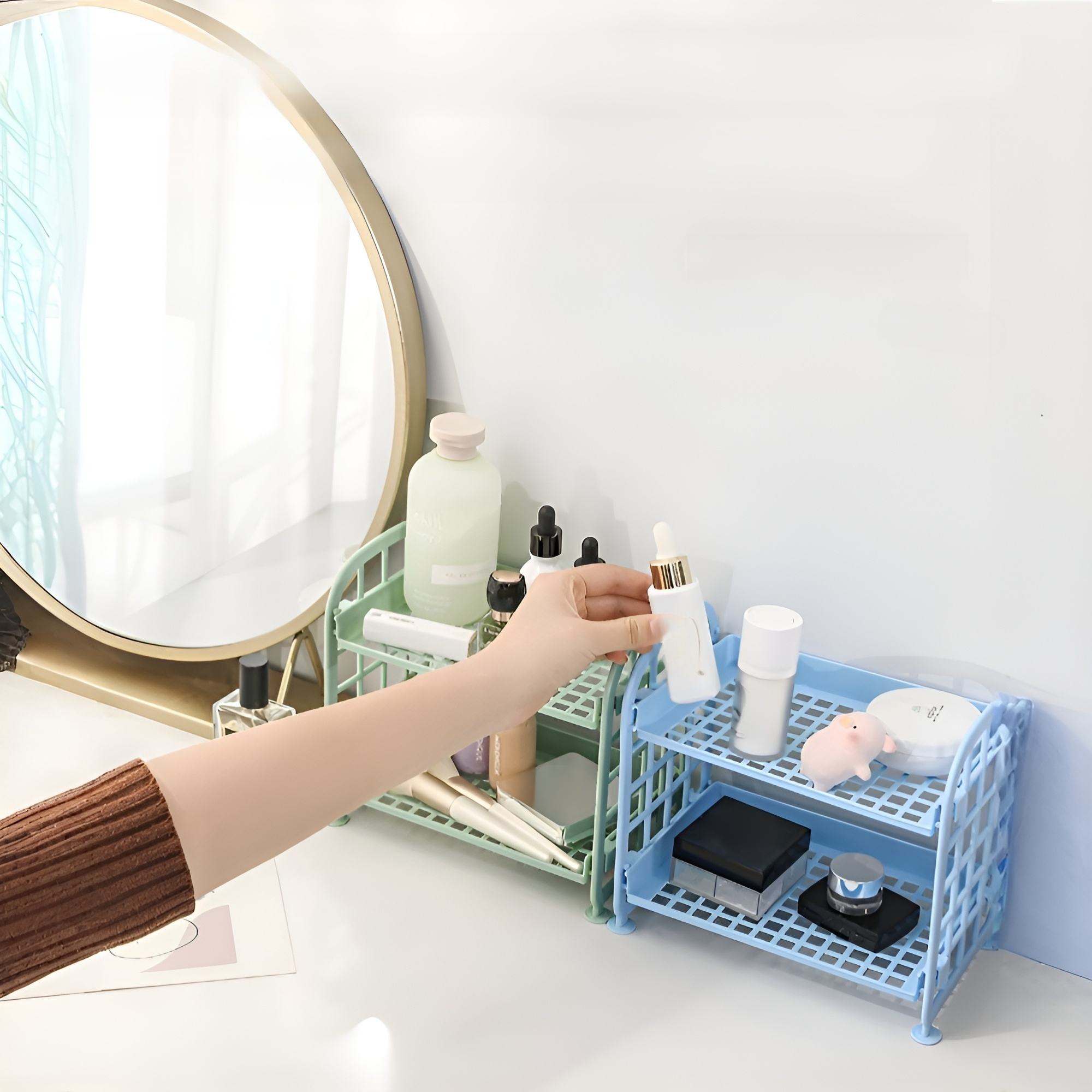 ● 二層式の大容量設計で、化粧品やジュエリーをすっきり整理収納でき、デスクトップを美しく保ちます。