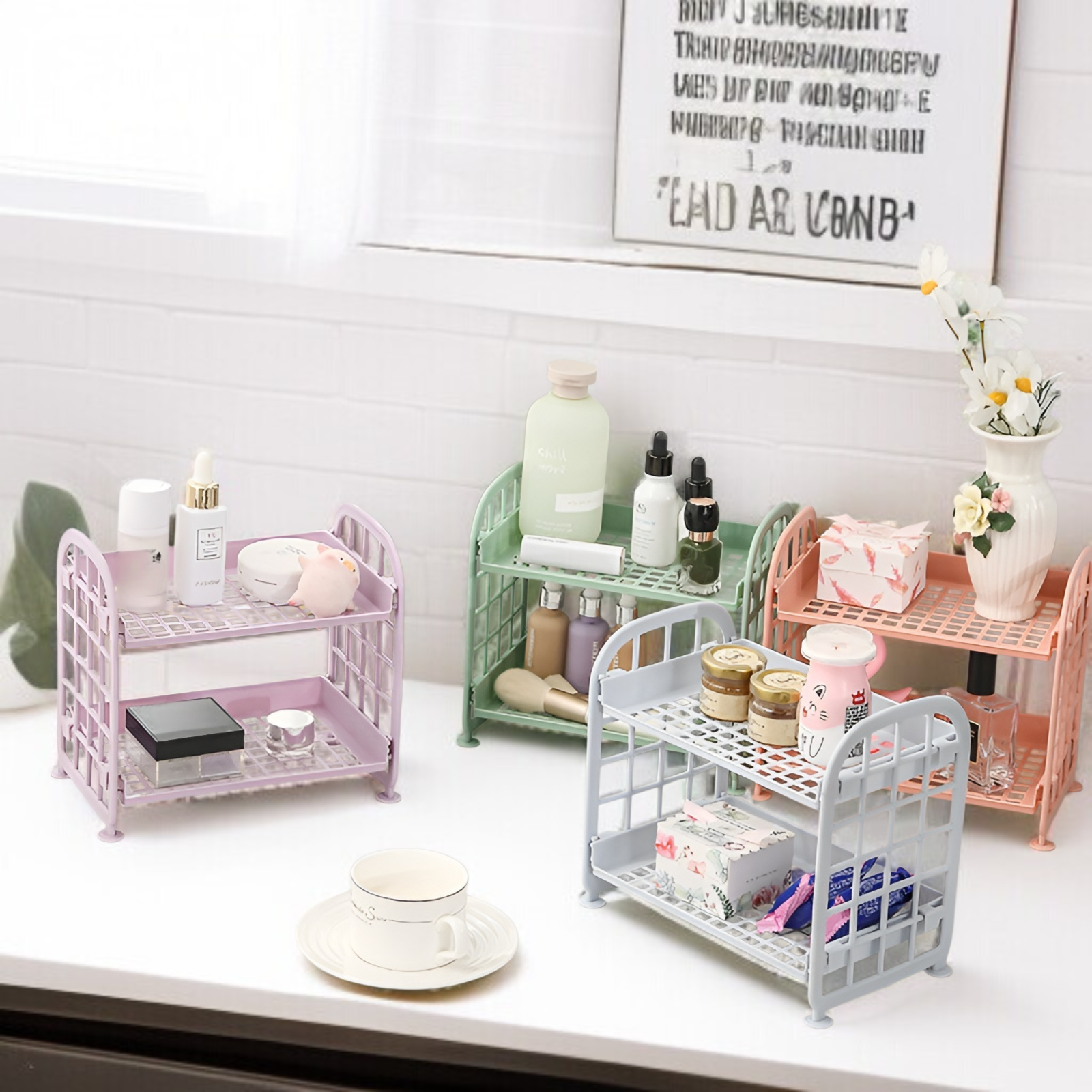 デスクトップ化粧品ジュエリーラック二層折りたたみ収納ラックシンプルな家庭用デスクトップバスルーム収納ラック